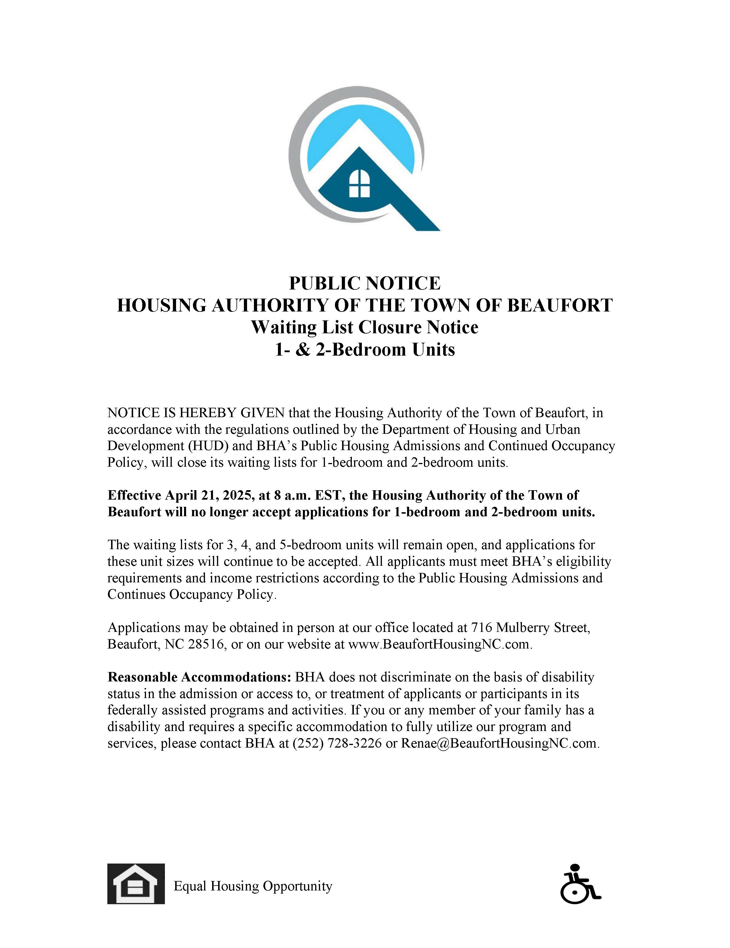 Effective April 21, 2025, the 1- and 2-bedroom waiting lists will be closed  click here to view full notice.